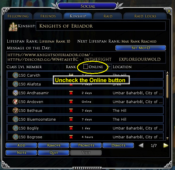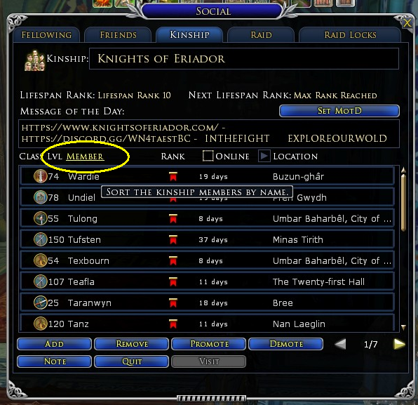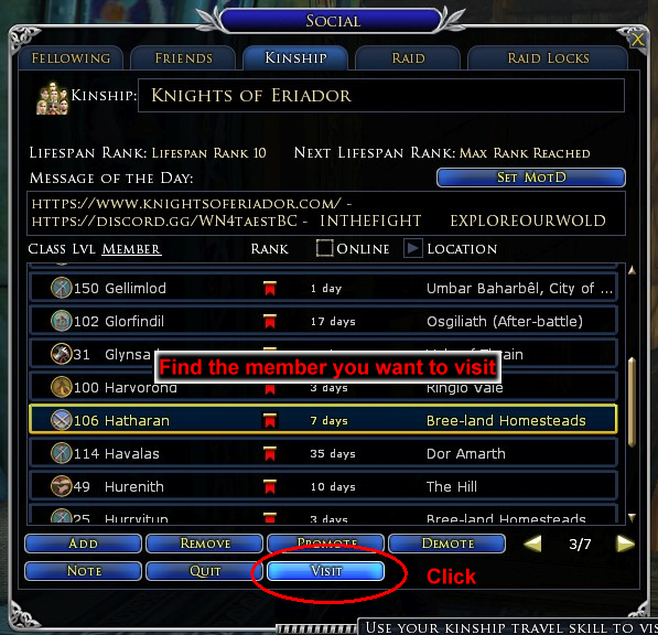 There is a skill button that you can add to your skill panel that allows you visit the same kinship member you visited last.